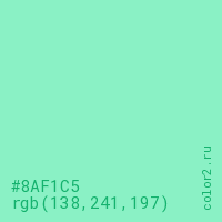 Цвет #8AF1C5 в цветовой модели RGB обозначается тремя октетами (138, 241, 197) в десятичном формате и #8AF1C5 в шестнадцатиричном (hex) формате, которые являются интенсивностью красного 138 (hex 8A), интенсивность зелёного 241 (hex F1) и интенсивность синего 197 (hex C5).