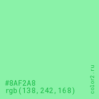 Цвет #8AF2A8 в цветовой модели RGB обозначается тремя октетами (138, 242, 168) в десятичном формате и #8AF2A8 в шестнадцатиричном (hex) формате, которые являются интенсивностью красного 138 (hex 8A), интенсивность зелёного 242 (hex F2) и интенсивность синего 168 (hex A8).