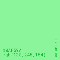 Цвет #8AF59A в цветовой модели RGB обозначается тремя октетами (138, 245, 154) в десятичном формате и #8AF59A в шестнадцатиричном (hex) формате, которые являются интенсивностью красного 138 (hex 8A), интенсивность зелёного 245 (hex F5) и интенсивность синего 154 (hex 9A).
