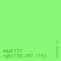 Цвет #8AF777 в цветовой модели RGB обозначается тремя октетами (138, 247, 119) в десятичном формате и #8AF777 в шестнадцатиричном (hex) формате, которые являются интенсивностью красного 138 (hex 8A), интенсивность зелёного 247 (hex F7) и интенсивность синего 119 (hex 77).