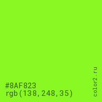 Цвет #8AF823 в цветовой модели RGB обозначается тремя октетами (138, 248, 35) в десятичном формате и #8AF823 в шестнадцатиричном (hex) формате, которые являются интенсивностью красного 138 (hex 8A), интенсивность зелёного 248 (hex F8) и интенсивность синего 35 (hex 23).