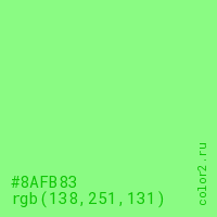 Цвет #8AFB83 в цветовой модели RGB обозначается тремя октетами (138, 251, 131) в десятичном формате и #8AFB83 в шестнадцатиричном (hex) формате, которые являются интенсивностью красного 138 (hex 8A), интенсивность зелёного 251 (hex FB) и интенсивность синего 131 (hex 83).
