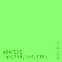 Цвет #8AFE6E в цветовой модели RGB обозначается тремя октетами (138, 254, 110) в десятичном формате и #8AFE6E в шестнадцатиричном (hex) формате, которые являются интенсивностью красного 138 (hex 8A), интенсивность зелёного 254 (hex FE) и интенсивность синего 110 (hex 6E).