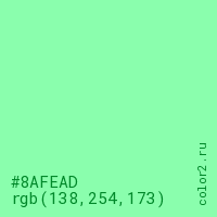Цвет #8AFEAD в цветовой модели RGB обозначается тремя октетами (138, 254, 173) в десятичном формате и #8AFEAD в шестнадцатиричном (hex) формате, которые являются интенсивностью красного 138 (hex 8A), интенсивность зелёного 254 (hex FE) и интенсивность синего 173 (hex AD).