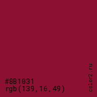 Цвет #8B1031 в цветовой модели RGB обозначается тремя октетами (139, 16, 49) в десятичном формате и #8B1031 в шестнадцатиричном (hex) формате, которые являются интенсивностью красного 139 (hex 8B), интенсивность зелёного 16 (hex 10) и интенсивность синего 49 (hex 31).