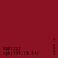 Цвет #8B1222 в цветовой модели RGB обозначается тремя октетами (139, 18, 34) в десятичном формате и #8B1222 в шестнадцатиричном (hex) формате, которые являются интенсивностью красного 139 (hex 8B), интенсивность зелёного 18 (hex 12) и интенсивность синего 34 (hex 22).