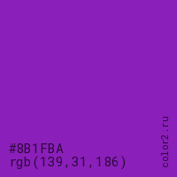 Цвет #8B1FBA в цветовой модели RGB обозначается тремя октетами (139, 31, 186) в десятичном формате и #8B1FBA в шестнадцатиричном (hex) формате, которые являются интенсивностью красного 139 (hex 8B), интенсивность зелёного 31 (hex 1F) и интенсивность синего 186 (hex BA).