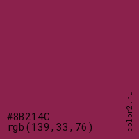 Цвет #8B214C в цветовой модели RGB обозначается тремя октетами (139, 33, 76) в десятичном формате и #8B214C в шестнадцатиричном (hex) формате, которые являются интенсивностью красного 139 (hex 8B), интенсивность зелёного 33 (hex 21) и интенсивность синего 76 (hex 4C).