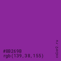 Цвет #8B269B в цветовой модели RGB обозначается тремя октетами (139, 38, 155) в десятичном формате и #8B269B в шестнадцатиричном (hex) формате, которые являются интенсивностью красного 139 (hex 8B), интенсивность зелёного 38 (hex 26) и интенсивность синего 155 (hex 9B).