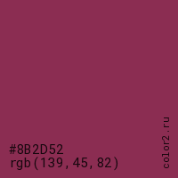 Цвет #8B2D52 в цветовой модели RGB обозначается тремя октетами (139, 45, 82) в десятичном формате и #8B2D52 в шестнадцатиричном (hex) формате, которые являются интенсивностью красного 139 (hex 8B), интенсивность зелёного 45 (hex 2D) и интенсивность синего 82 (hex 52).