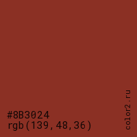 Цвет #8B3024 в цветовой модели RGB обозначается тремя октетами (139, 48, 36) в десятичном формате и #8B3024 в шестнадцатиричном (hex) формате, которые являются интенсивностью красного 139 (hex 8B), интенсивность зелёного 48 (hex 30) и интенсивность синего 36 (hex 24).