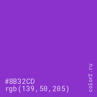 Цвет #8B32CD в цветовой модели RGB обозначается тремя октетами (139, 50, 205) в десятичном формате и #8B32CD в шестнадцатиричном (hex) формате, которые являются интенсивностью красного 139 (hex 8B), интенсивность зелёного 50 (hex 32) и интенсивность синего 205 (hex CD).
