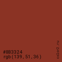 Цвет #8B3324 в цветовой модели RGB обозначается тремя октетами (139, 51, 36) в десятичном формате и #8B3324 в шестнадцатиричном (hex) формате, которые являются интенсивностью красного 139 (hex 8B), интенсивность зелёного 51 (hex 33) и интенсивность синего 36 (hex 24).