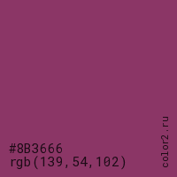 Цвет #8B3666 в цветовой модели RGB обозначается тремя октетами (139, 54, 102) в десятичном формате и #8B3666 в шестнадцатиричном (hex) формате, которые являются интенсивностью красного 139 (hex 8B), интенсивность зелёного 54 (hex 36) и интенсивность синего 102 (hex 66).