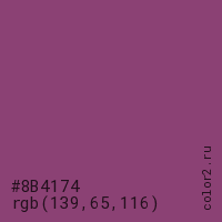 Цвет #8B4174 в цветовой модели RGB обозначается тремя октетами (139, 65, 116) в десятичном формате и #8B4174 в шестнадцатиричном (hex) формате, которые являются интенсивностью красного 139 (hex 8B), интенсивность зелёного 65 (hex 41) и интенсивность синего 116 (hex 74).