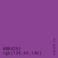 Цвет #8B4292 в цветовой модели RGB обозначается тремя октетами (139, 66, 146) в десятичном формате и #8B4292 в шестнадцатиричном (hex) формате, которые являются интенсивностью красного 139 (hex 8B), интенсивность зелёного 66 (hex 42) и интенсивность синего 146 (hex 92).