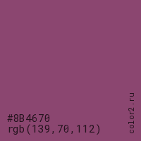 Цвет #8B4670 в цветовой модели RGB обозначается тремя октетами (139, 70, 112) в десятичном формате и #8B4670 в шестнадцатиричном (hex) формате, которые являются интенсивностью красного 139 (hex 8B), интенсивность зелёного 70 (hex 46) и интенсивность синего 112 (hex 70).