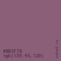 Цвет #8B5F78 в цветовой модели RGB обозначается тремя октетами (139, 95, 120) в десятичном формате и #8B5F78 в шестнадцатиричном (hex) формате, которые являются интенсивностью красного 139 (hex 8B), интенсивность зелёного 95 (hex 5F) и интенсивность синего 120 (hex 78).