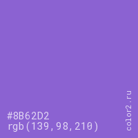 Цвет #8B62D2 в цветовой модели RGB обозначается тремя октетами (139, 98, 210) в десятичном формате и #8B62D2 в шестнадцатиричном (hex) формате, которые являются интенсивностью красного 139 (hex 8B), интенсивность зелёного 98 (hex 62) и интенсивность синего 210 (hex D2).