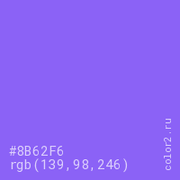 Цвет #8B62F6 в цветовой модели RGB обозначается тремя октетами (139, 98, 246) в десятичном формате и #8B62F6 в шестнадцатиричном (hex) формате, которые являются интенсивностью красного 139 (hex 8B), интенсивность зелёного 98 (hex 62) и интенсивность синего 246 (hex F6).