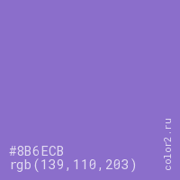 Цвет #8B6ECB в цветовой модели RGB обозначается тремя октетами (139, 110, 203) в десятичном формате и #8B6ECB в шестнадцатиричном (hex) формате, которые являются интенсивностью красного 139 (hex 8B), интенсивность зелёного 110 (hex 6E) и интенсивность синего 203 (hex CB).