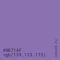 Цвет #8B71AF в цветовой модели RGB обозначается тремя октетами (139, 113, 175) в десятичном формате и #8B71AF в шестнадцатиричном (hex) формате, которые являются интенсивностью красного 139 (hex 8B), интенсивность зелёного 113 (hex 71) и интенсивность синего 175 (hex AF).
