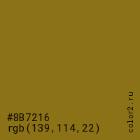 Цвет #8B7216 в цветовой модели RGB обозначается тремя октетами (139, 114, 22) в десятичном формате и #8B7216 в шестнадцатиричном (hex) формате, которые являются интенсивностью красного 139 (hex 8B), интенсивность зелёного 114 (hex 72) и интенсивность синего 22 (hex 16).