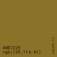 Цвет #8B7229 в цветовой модели RGB обозначается тремя октетами (139, 114, 41) в десятичном формате и #8B7229 в шестнадцатиричном (hex) формате, которые являются интенсивностью красного 139 (hex 8B), интенсивность зелёного 114 (hex 72) и интенсивность синего 41 (hex 29).