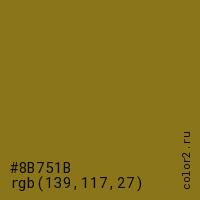 Цвет #8B751B в цветовой модели RGB обозначается тремя октетами (139, 117, 27) в десятичном формате и #8B751B в шестнадцатиричном (hex) формате, которые являются интенсивностью красного 139 (hex 8B), интенсивность зелёного 117 (hex 75) и интенсивность синего 27 (hex 1B).
