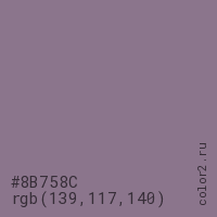 Цвет #8B758C в цветовой модели RGB обозначается тремя октетами (139, 117, 140) в десятичном формате и #8B758C в шестнадцатиричном (hex) формате, которые являются интенсивностью красного 139 (hex 8B), интенсивность зелёного 117 (hex 75) и интенсивность синего 140 (hex 8C).