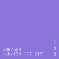 Цвет #8B75DB в цветовой модели RGB обозначается тремя октетами (139, 117, 219) в десятичном формате и #8B75DB в шестнадцатиричном (hex) формате, которые являются интенсивностью красного 139 (hex 8B), интенсивность зелёного 117 (hex 75) и интенсивность синего 219 (hex DB).