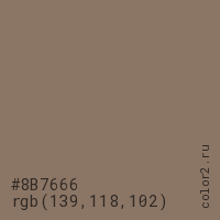 Цвет #8B7666 в цветовой модели RGB обозначается тремя октетами (139, 118, 102) в десятичном формате и #8B7666 в шестнадцатиричном (hex) формате, которые являются интенсивностью красного 139 (hex 8B), интенсивность зелёного 118 (hex 76) и интенсивность синего 102 (hex 66).