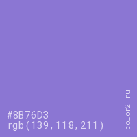 Цвет #8B76D3 в цветовой модели RGB обозначается тремя октетами (139, 118, 211) в десятичном формате и #8B76D3 в шестнадцатиричном (hex) формате, которые являются интенсивностью красного 139 (hex 8B), интенсивность зелёного 118 (hex 76) и интенсивность синего 211 (hex D3).