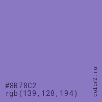 Цвет #8B78C2 в цветовой модели RGB обозначается тремя октетами (139, 120, 194) в десятичном формате и #8B78C2 в шестнадцатиричном (hex) формате, которые являются интенсивностью красного 139 (hex 8B), интенсивность зелёного 120 (hex 78) и интенсивность синего 194 (hex C2).