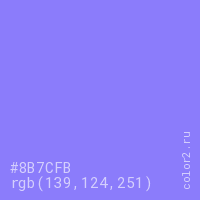 Цвет #8B7CFB в цветовой модели RGB обозначается тремя октетами (139, 124, 251) в десятичном формате и #8B7CFB в шестнадцатиричном (hex) формате, которые являются интенсивностью красного 139 (hex 8B), интенсивность зелёного 124 (hex 7C) и интенсивность синего 251 (hex FB).