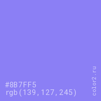 Цвет #8B7FF5 в цветовой модели RGB обозначается тремя октетами (139, 127, 245) в десятичном формате и #8B7FF5 в шестнадцатиричном (hex) формате, которые являются интенсивностью красного 139 (hex 8B), интенсивность зелёного 127 (hex 7F) и интенсивность синего 245 (hex F5).