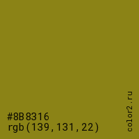 Цвет #8B8316 в цветовой модели RGB обозначается тремя октетами (139, 131, 22) в десятичном формате и #8B8316 в шестнадцатиричном (hex) формате, которые являются интенсивностью красного 139 (hex 8B), интенсивность зелёного 131 (hex 83) и интенсивность синего 22 (hex 16).