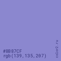 Цвет #8B87CF в цветовой модели RGB обозначается тремя октетами (139, 135, 207) в десятичном формате и #8B87CF в шестнадцатиричном (hex) формате, которые являются интенсивностью красного 139 (hex 8B), интенсивность зелёного 135 (hex 87) и интенсивность синего 207 (hex CF).