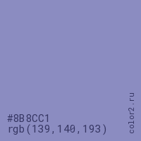 Цвет #8B8CC1 в цветовой модели RGB обозначается тремя октетами (139, 140, 193) в десятичном формате и #8B8CC1 в шестнадцатиричном (hex) формате, которые являются интенсивностью красного 139 (hex 8B), интенсивность зелёного 140 (hex 8C) и интенсивность синего 193 (hex C1).