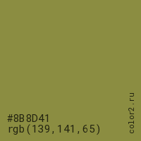 Цвет #8B8D41 в цветовой модели RGB обозначается тремя октетами (139, 141, 65) в десятичном формате и #8B8D41 в шестнадцатиричном (hex) формате, которые являются интенсивностью красного 139 (hex 8B), интенсивность зелёного 141 (hex 8D) и интенсивность синего 65 (hex 41).