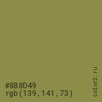 Цвет #8B8D49 в цветовой модели RGB обозначается тремя октетами (139, 141, 73) в десятичном формате и #8B8D49 в шестнадцатиричном (hex) формате, которые являются интенсивностью красного 139 (hex 8B), интенсивность зелёного 141 (hex 8D) и интенсивность синего 73 (hex 49).