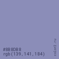 Цвет #8B8DB8 в цветовой модели RGB обозначается тремя октетами (139, 141, 184) в десятичном формате и #8B8DB8 в шестнадцатиричном (hex) формате, которые являются интенсивностью красного 139 (hex 8B), интенсивность зелёного 141 (hex 8D) и интенсивность синего 184 (hex B8).