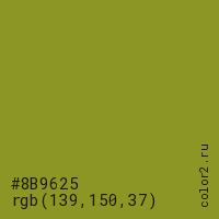 Цвет #8B9625 в цветовой модели RGB обозначается тремя октетами (139, 150, 37) в десятичном формате и #8B9625 в шестнадцатиричном (hex) формате, которые являются интенсивностью красного 139 (hex 8B), интенсивность зелёного 150 (hex 96) и интенсивность синего 37 (hex 25).