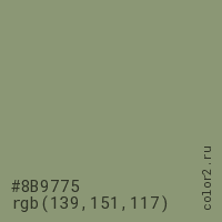 Цвет #8B9775 в цветовой модели RGB обозначается тремя октетами (139, 151, 117) в десятичном формате и #8B9775 в шестнадцатиричном (hex) формате, которые являются интенсивностью красного 139 (hex 8B), интенсивность зелёного 151 (hex 97) и интенсивность синего 117 (hex 75).
