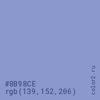 Цвет #8B98CE в цветовой модели RGB обозначается тремя октетами (139, 152, 206) в десятичном формате и #8B98CE в шестнадцатиричном (hex) формате, которые являются интенсивностью красного 139 (hex 8B), интенсивность зелёного 152 (hex 98) и интенсивность синего 206 (hex CE).
