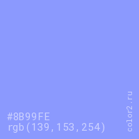 Цвет #8B99FE в цветовой модели RGB обозначается тремя октетами (139, 153, 254) в десятичном формате и #8B99FE в шестнадцатиричном (hex) формате, которые являются интенсивностью красного 139 (hex 8B), интенсивность зелёного 153 (hex 99) и интенсивность синего 254 (hex FE).