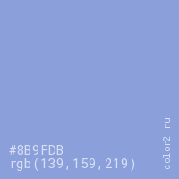 Цвет #8B9FDB в цветовой модели RGB обозначается тремя октетами (139, 159, 219) в десятичном формате и #8B9FDB в шестнадцатиричном (hex) формате, которые являются интенсивностью красного 139 (hex 8B), интенсивность зелёного 159 (hex 9F) и интенсивность синего 219 (hex DB).