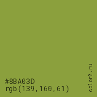 Цвет #8BA03D в цветовой модели RGB обозначается тремя октетами (139, 160, 61) в десятичном формате и #8BA03D в шестнадцатиричном (hex) формате, которые являются интенсивностью красного 139 (hex 8B), интенсивность зелёного 160 (hex A0) и интенсивность синего 61 (hex 3D).