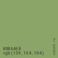 Цвет #8BA468 в цветовой модели RGB обозначается тремя октетами (139, 164, 104) в десятичном формате и #8BA468 в шестнадцатиричном (hex) формате, которые являются интенсивностью красного 139 (hex 8B), интенсивность зелёного 164 (hex A4) и интенсивность синего 104 (hex 68).