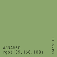 Цвет #8BA66C в цветовой модели RGB обозначается тремя октетами (139, 166, 108) в десятичном формате и #8BA66C в шестнадцатиричном (hex) формате, которые являются интенсивностью красного 139 (hex 8B), интенсивность зелёного 166 (hex A6) и интенсивность синего 108 (hex 6C).